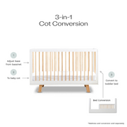 The Aspen Classic Cot - White/Natural has two base levels and converts to a toddler bed with the Aspen Cot Toddler Bed Half Frame (sold separately) - providing longevity without compromising style. As your child grows, rest easy knowing your cot can adapt alongside them.