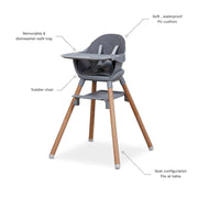 The Macey 3-in-1 Highchair adapts to your child's growing needs. Start with the high chair and tray configuration, then remove the tray to seat the highchair at the table and lastly transition to a comfortable toddler chair - saving you from the hassle of purchasing multiple seats.