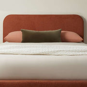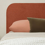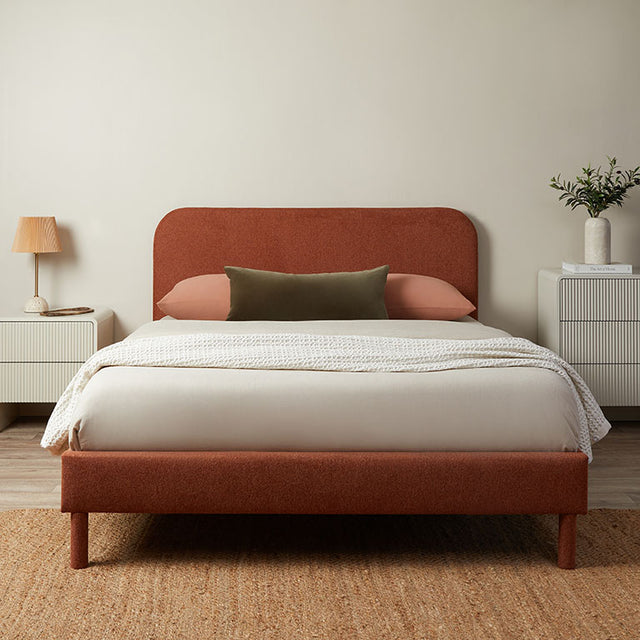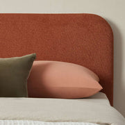 The Melvin Queen Bed features a curved bedhead wrapped in clay fabric for a stylish look. This modern coastal design adds warmth and sophistication to your bedroom.