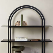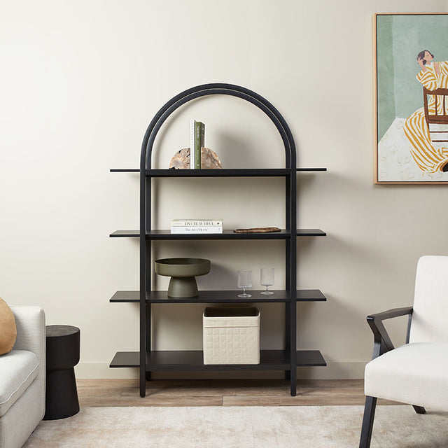 The Alfie Arched Shelves - Black feature four MDF shelves and a sturdy metal frame with a sleek arch design. Perfect for display or office use, these shelves add a touch of industrial style to any room. The black metal frame gives a modern, clean look that fits well in both home and work spaces.