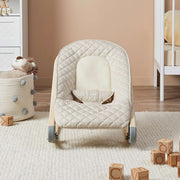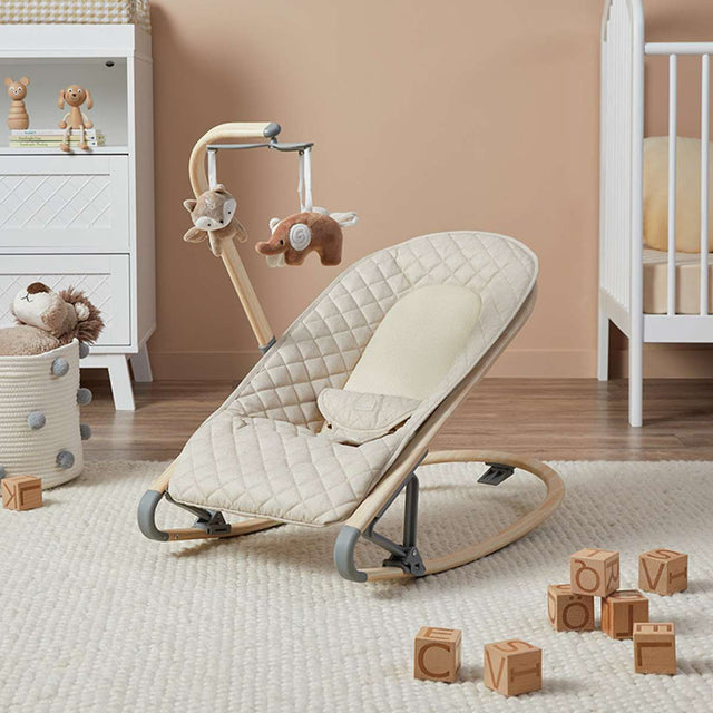 The Raven Rocker in Natural is perfect for a nursery or living room. It folds down easily, has a removable, washable cover, and comes with a detachable toy mobile. Keep your baby entertained and comfortable.
