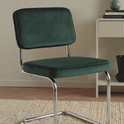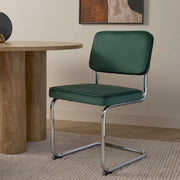 Elevate your dining space with the Marcel Chrome Dining Chair set. Featuring a retro mid-century design with a sleek chrome frame, these cushioned chairs provide style and comfort. The deep green velvet finish adds a touch of warmth, making them perfect for modern or vintage-inspired interiors. Ideal for dining rooms, kitchen areas, or versatile seating across your home.