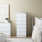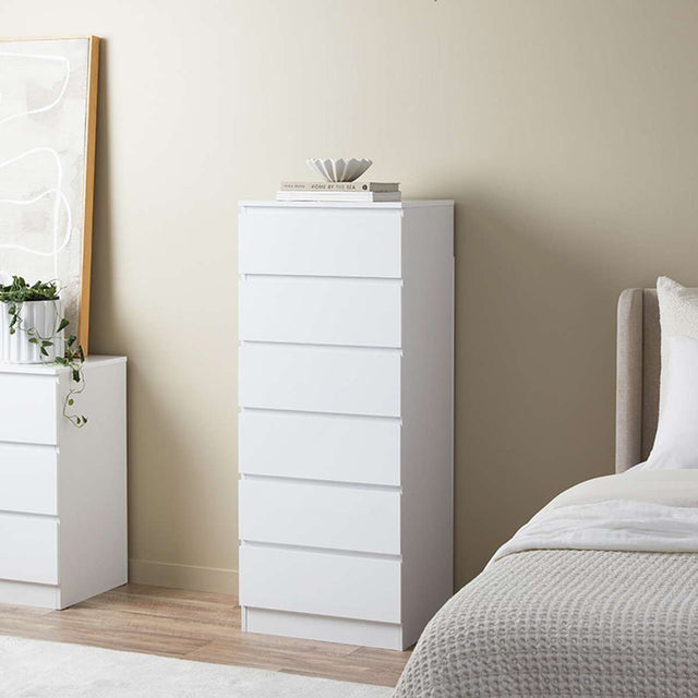 The Jolt Six Drawer - Slim - White features a tall, slimline design that maximises the storage space of any room, without taking up precious floor space. With a contemporary design of white, gloss drawer fronts, this unit is a simple and stylish storage option.