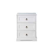 Our Hamptons Bedside Table will give any bedroom a classic Hamptons style. With an elegant shape and stunning details, this side table comes in a simple white finish with metal ring handles and signature Hamptons VJ panelled sides. All details offering a look that is relaxed and elegant. Featuring three sliding drawers, you have plenty of storage beside a bed, along with enough surface on top for a lamp, a book and décor. Perfect for a master bedroom, kids bedroom or guest bedroom.