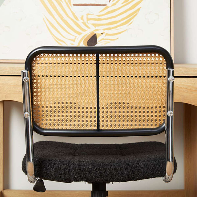 Upgrade your home office with the Asher Rattan Office Chair in Black/Natural. Featuring a comfy cushion seat and stylish rattan back, this swivel chair with casters brings mid-century design into any workspace. The on-trend black boucle and natural rattan blend perfectly for a modern look that suits any room needing a touch of style.