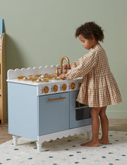 Embark on a culinary adventure with the Kids Cottage Kitchen, crafted to spark imagination and creative play with an interactive oven, baking trays, hotplates and a sink.