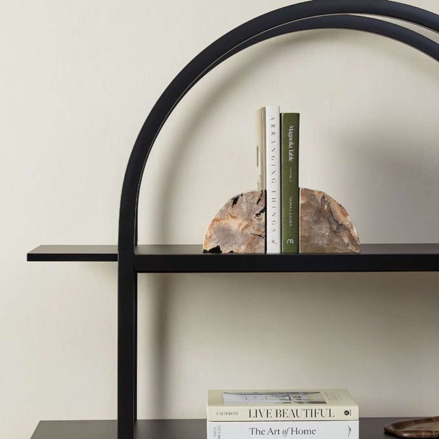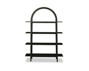 The Alfie Arched Shelves - Black feature four MDF shelves and a sturdy metal frame with a sleek arch design. Perfect for display or office use, these shelves add a touch of industrial style to any room. The black metal frame gives a modern, clean look that fits well in both home and work spaces.