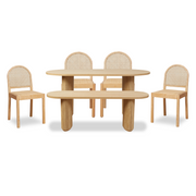 Introducing the Amara Table Bench and Mateo Six Piece Dining Set – the perfect blend of style and functionality. Featuring the Amara Six Seater Dining Table with its elegant curved top and fluted legs, paired with the sturdy Amara Bench Seat, and complemented by the Mateo Curved Rattan Dining Chairs. The natural wood and rattan finishes harmonise beautifully, creating a cohesive and inviting dining space for both family meals and casual entertaining.