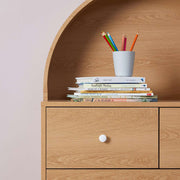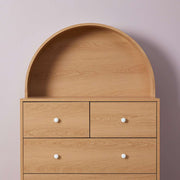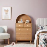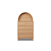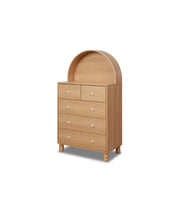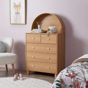 Introducing the Archie Tallboy by Mocka! This natural chest of drawers is perfect for modern bedrooms or studies, with 5 spacious drawers, rubberwood legs, a white handle, and a fun arched top design. Mix and match with the Archie desk and bookcase for a cohesive look.