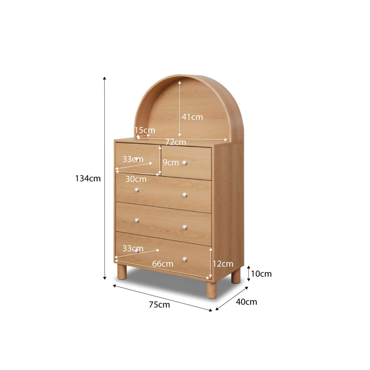 Introducing the Archie Tallboy by Mocka! This natural chest of drawers is perfect for modern bedrooms or studies, with 5 spacious drawers, rubberwood legs, a white handle, and a fun arched top design. Mix and match with the Archie desk and bookcase for a cohesive look.