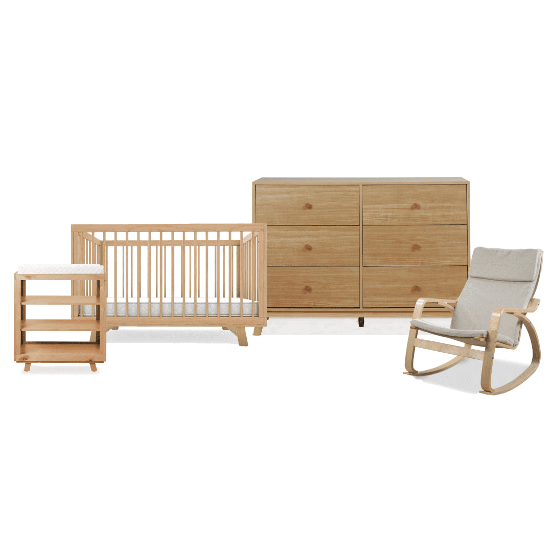 Discover the Aspen Natural Six Piece Nursery Set, the perfect ensemble of contemporary, practical nursery pieces to create a tranquil sanctuary for bub. This set includes the bestselling Aspen Cot in Birch, the matching Aspen Change Table with ample storage, the hypoallergenic Mocka Bamboo Cot Mattress, a water-resistant Quilted Change Mat, the spacious Aspen Six Drawer unit in Birch, and the chic Asta Rocker in neutral Oatmeal. This full-room nursery set promotes stylish comfort and seamless utility.