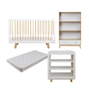 The Aspen White Natural Five Piece Nursery Furniture Set offers a cohesive and practical solution for your baby's room. Featuring the Aspen classic cot, bamboo mattress, change table with quilted mat, and bookcase, this set combines style and functionality. The white and natural colour scheme creates a fresh, timeless look that suits any nursery decor.