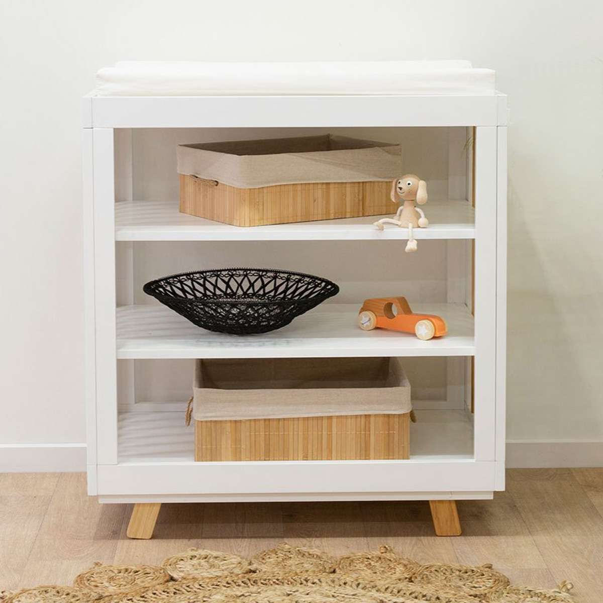 Crafted with care, each piece in this set boasts quality materials and construction. The cot's adjustable base, the change table's ample storage, and the bookcase's sturdy shelves all contribute to a durable and long-lasting nursery solution that grows with your child.
