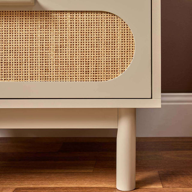 The soft beige tone and rounded rattan-look drawer fronts create a modern coastal look. This timeless design blends naturally with various bedroom styles, adding warmth and character to your space.