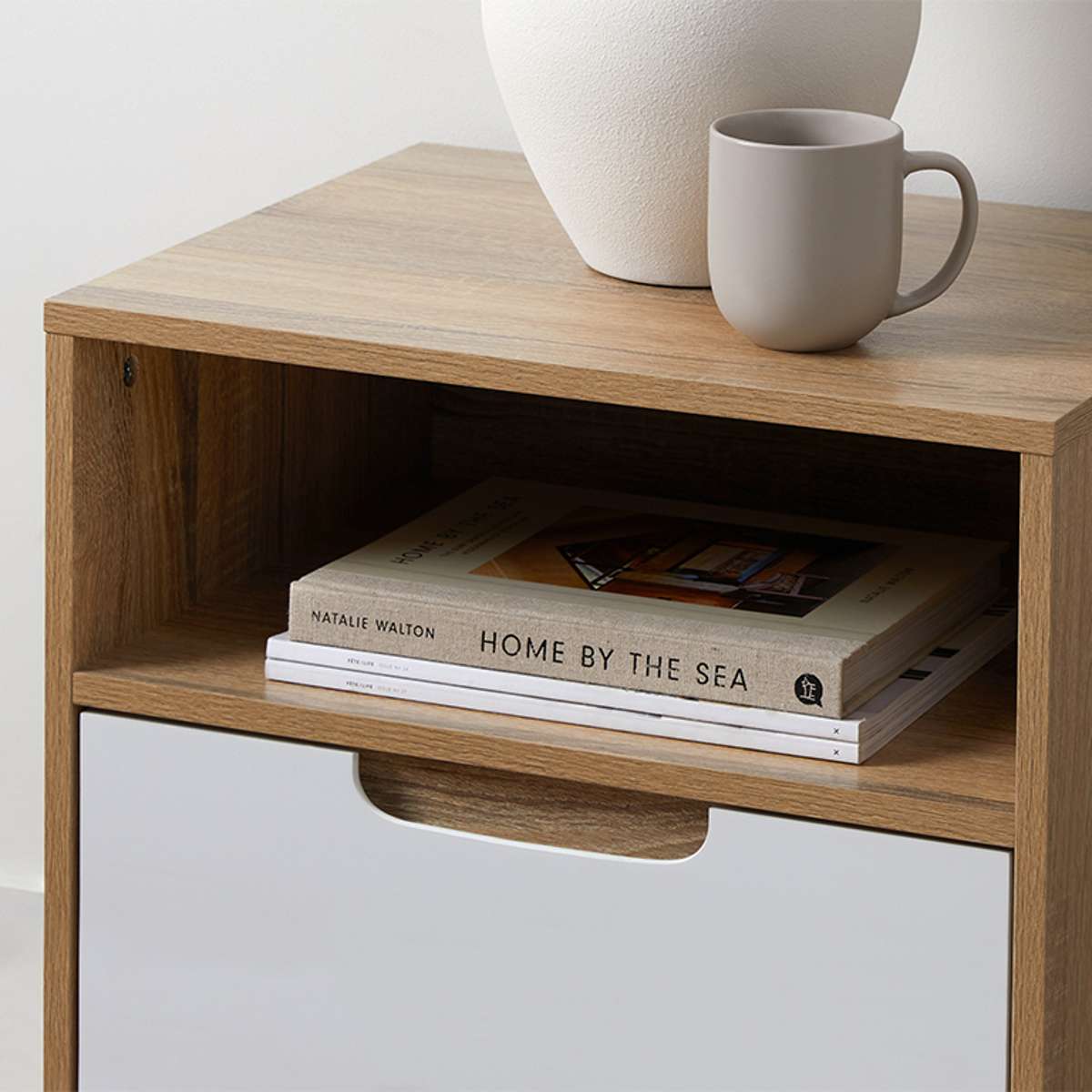Reimagine your bedroom or living space with the Mocka Chelsea Bedside Table. Boasting both a drawer and open shelf storage, keeping essentials within easy reach (not to mention adding a chic style option to a room) has never been easier.