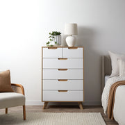 Proving practical, functional design doesn't have to compromise on style, the Chelsea Tallboy is bright, chic, and elegant. Four large and spacious sliding drawers, with two smaller sliding drawers at the top, give you ample storage space to keep all your clothes and treasured items tidy. Simply add to a bedroom for chic additional clothes storage or use in the nursery for keeping all of bubs things clean and tidy. You'll maximise your storage and style all in one go, no matter where you fit this beauty in your home. This dresser unit utilises more vertical space than floor space. This makes it a great option for smaller bedrooms, low on in-built storage. Make use of the wide surface by adding those finishing decor pieces on top for a truly standout style or prop a mirror up and you can use it to put on your makeup and earrings before heading off to work. This dresser has plenty of space for any busy household or business, you'll have all your storage and styling needs covered. The simple and elegant colour palate and timber and crisp white design revitalises and brightens a space. The crisp, white drawers reflect the available light in a room making it look bigger and brighter. You'll love the signature statement style the Chelsea range brings to a home and can easily complement a variety of interior styles. Check out the rest of the Chelsea Range for the same signature look. Chic and stylish, give your bedroom an elegant makeover with the Chelsea Tallboy. If you like this style, be sure to check out the full Chelsea range.