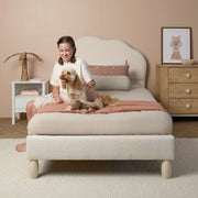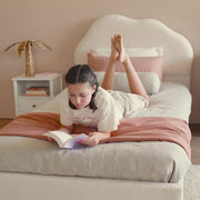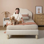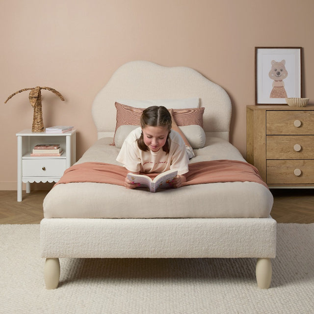 Transform your child’s bedroom into a dreamy retreat with the Cosy Cloud King Single Bed in soft ivory teddy fabric. Featuring a cloud-shaped bedhead, solid painted wooden legs, and a tactile design, this bed combines comfort and style. Perfect for creating a calm and cosy space for little ones to rest and recharge.