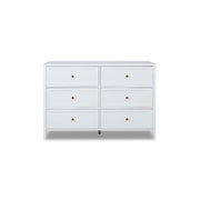 The Cove Six Drawer - White is a classic coastal-style dresser that adds a timeless look to any room. It features six roomy pull-to-open drawers with simple round metal knobs and a chic shaker frame. Ideal for bedrooms or living areas, this sturdy MDF frame piece blends style and function perfectly.
