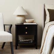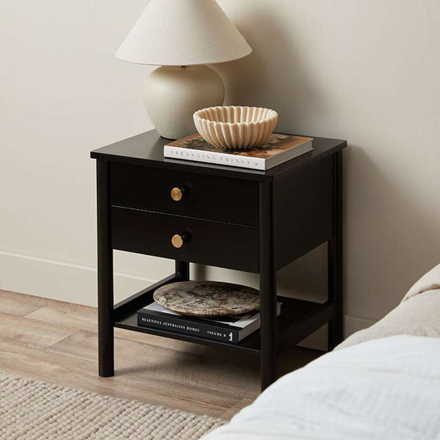 Introducing the Delaney Bedside Table - Black: a timeless piece for your bedroom. Made from MDF with sturdy pine wood legs, it features two smooth sliding drawers and a handy shelf. The sleek black finish and elegant gold handles blend farmhouse charm with modern style, perfect for any cosy or contemporary room.