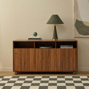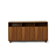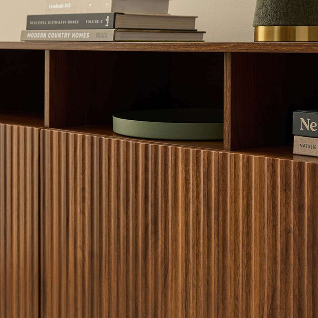Inspired by mid-century style, the walnut finish and fluted cupboard doors bring on-trend sophistication to any room. The rounded wooden ball feet add charm and a soft, modern touch.