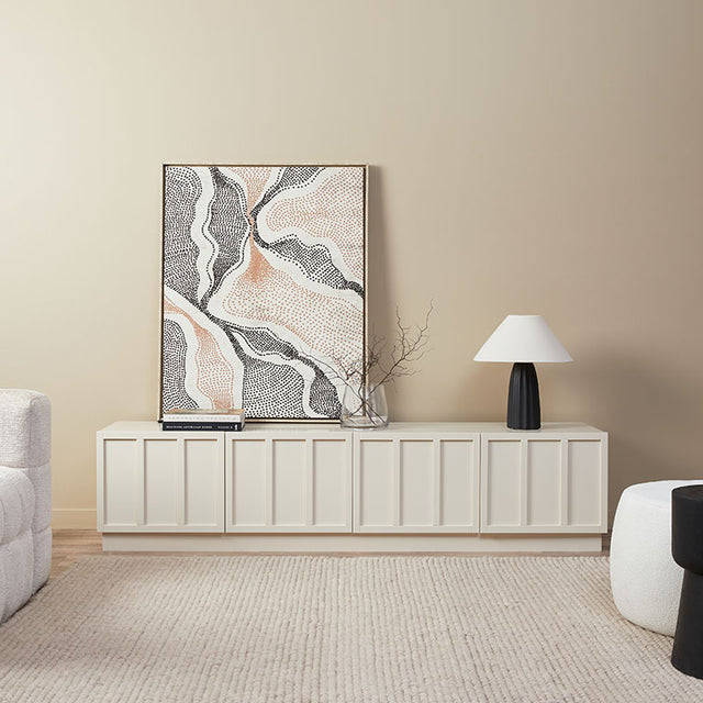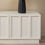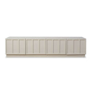 Upgrade your living room with the Emery Panel Entertainment Unit in Beige. Featuring four easy-to-open cupboard doors, it offers plenty of storage. The low, wide design is perfect for placing under your TV. Its Japandi-inspired look and unique panel doors add a stylish touch to any room.