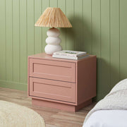 The Eros Bedside Table - Pink is perfect for modern coastal living. Made from durable MDF, it features two push-to-open drawers for ample storage. Its trendy clay pink colour and shaker-style drawer fronts will complement any bedroom or kids’ room beautifully.