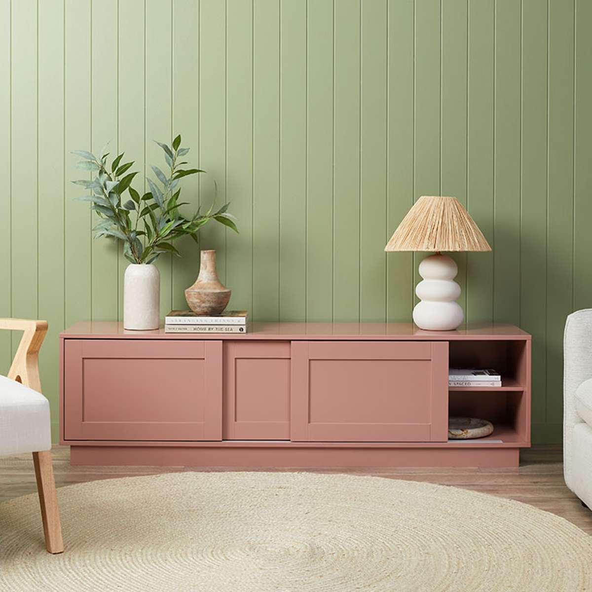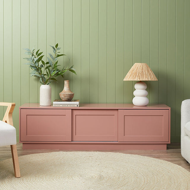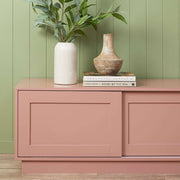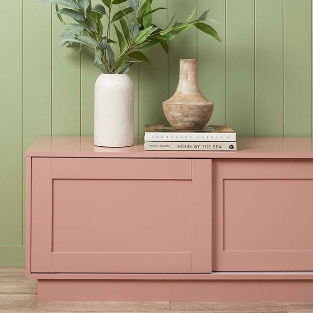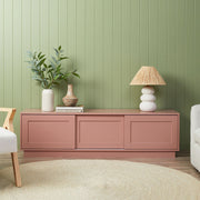 The Eros Entertainment Unit in a fashionable clay pink tone brings a modern coastal vibe to any lounge or living space. Made from sturdy MDF, it features 3 sliding doors and handy cable holes at the back for easy access. Its functional, classic shaker style makes it the perfect blend of style and practicality.