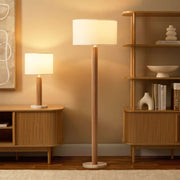 The Eve White Marble Base Table Lamp features a polished marble base and beechwood ribbing detail. This design complements any decor, adding a touch of elegance and style to your living space.