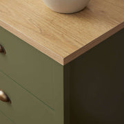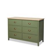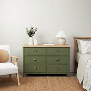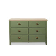 Introducing the Hastings Six Drawer in Olive Green/Natural, perfect for any bedroom or living space. Crafted from durable MDF with a stylish mix of green and light wood-look, it reflects modern farmhouse charm. Featuring six easy-slide metal handles, this timeless dresser combines functionality with a chic, sophisticated elegance.
