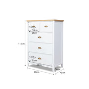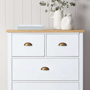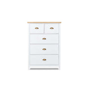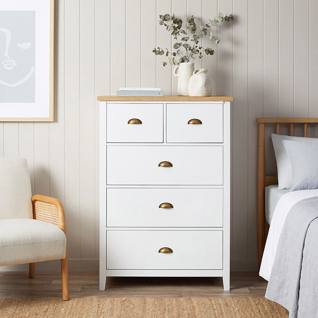 This tallboy has a light timber top and fresh white drawers; great for adding a bright touch to any room. Perfect for keeping clothes organised, this tallboy has five drawers, including two small ones at the top. Its slim design saves space, making it great for any space.