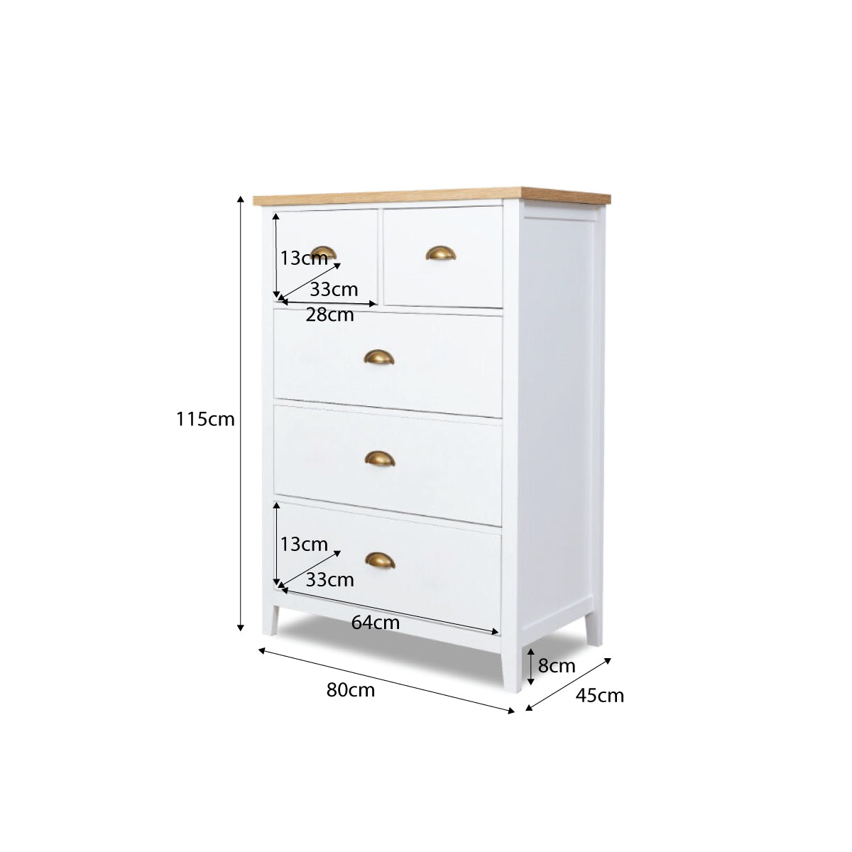 Legs - 8cm high. Inner top drawers - 28cm wide x 13cm high x 33cm deep. Other drawers - 64cm wide x 13cm high x 33cm deep