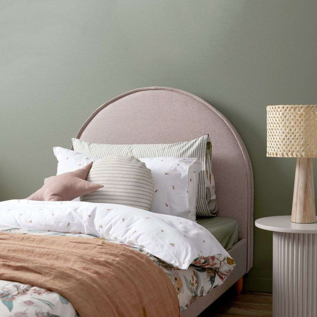 Well-constructed with a strong frame, wooden slats and supportive legs, this bed is super sturdy for kids and guests to sleep with ease. With a fresh and modern design, this bed features an upholstered, arch bedhead and frame that your child won't easily outgrow and that'll suit the decor in your home, guest bedroom or holiday accommodation. We love the dusty pink colourway is soft and dreamy. Providing the perfect warm backdrop for bed linens, kid's quilts, and cushions, you can easily change up the style of the bedding seasonally.
