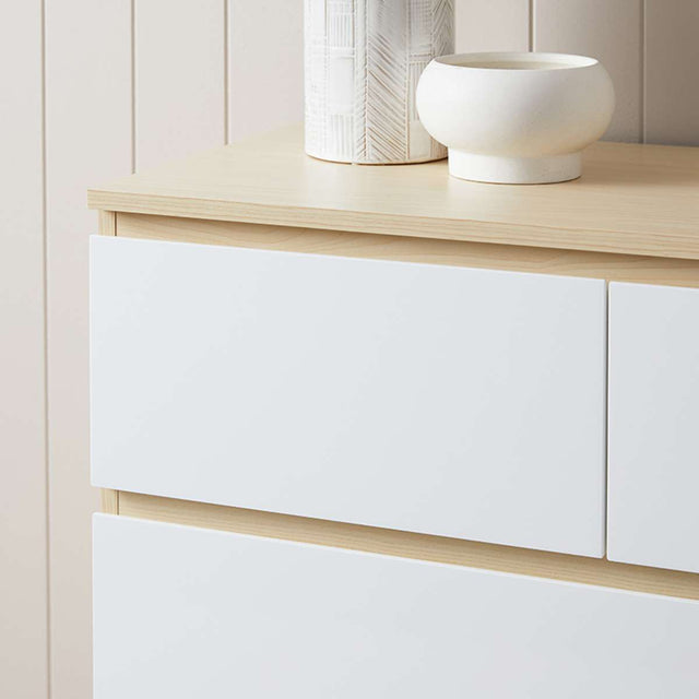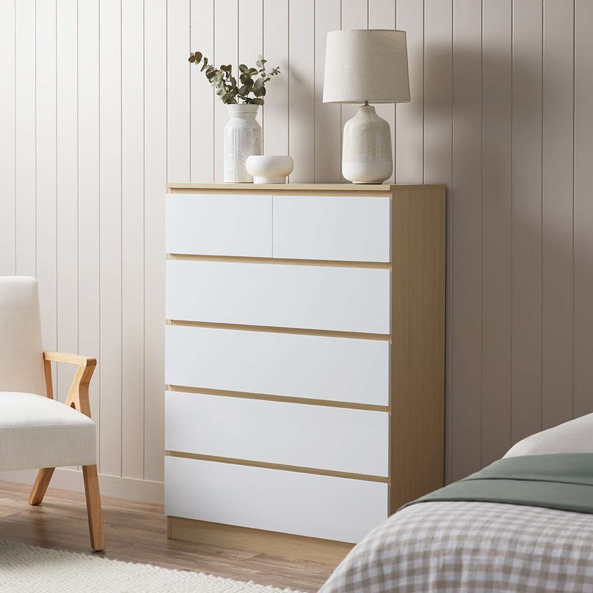 Mocka Jolt Tallboy Drawers - Natural / White will provide you with additional storage for your bedroom. Featuring six drawers, the design allows for sectioned storage to separate your shirts from your shorts. Although practical the Jolt Tallboy boasts modern design aesthetics.