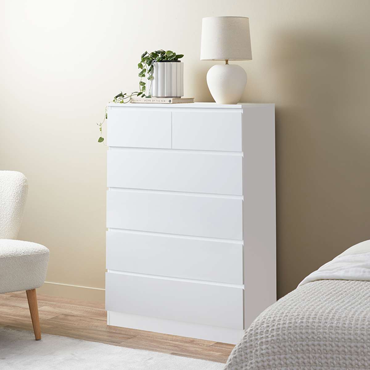 Mocka Jolt Tallboy Drawers - White will provide you with additional storage for your bedroom. Featuring six drawers, the design allows for sectioned storage to separate your shirts from your shorts. Although practical the Jolt Tallboy boasts modern design aesthetics. Install stylish storage in your bedroom with Mocka's Jolt Tallboy.
