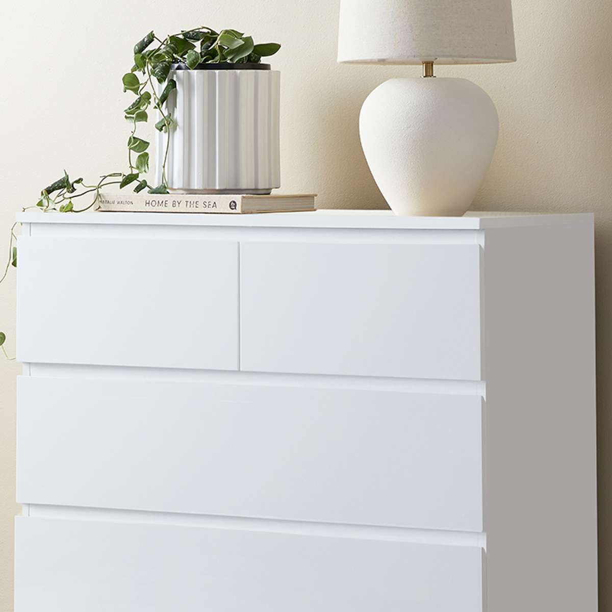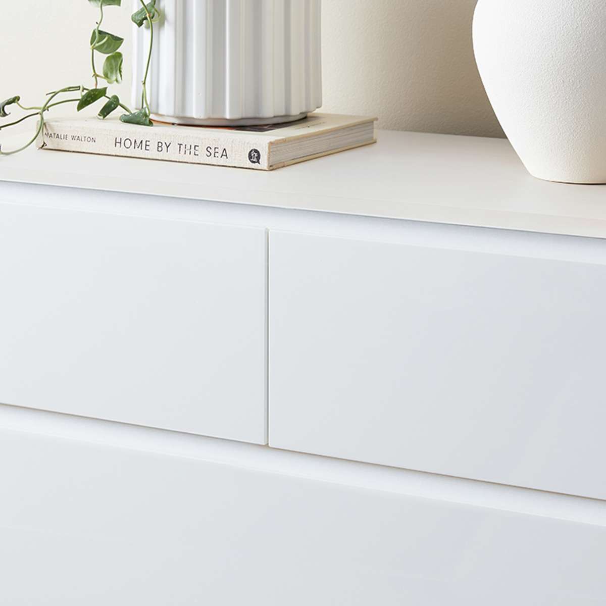 Mocka Jolt Tallboy Drawers - White will help to keep your bedroom organised in one contemporary unit. The classic design of the Jolt Tallboy provides you with six drawers where you can store almost anything from clothes to bed linen.