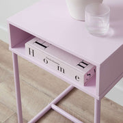The Jude Bedside Table - Lilac is a stylish and functional piece with an open shelf and sturdy metal frame. Its sweet lilac tone makes it perfect for a child's bedroom or as a handy side table in the living room. Ideal for smaller rooms, its compact size fits beautifully anywhere.