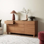 Introducing the Leeroy Buffet in Hazelnut – the perfect blend of style and function. With its chunky solid wood legs and mid-century curves, it adds a touch of elegance to any room. Featuring three drawers and three cupboards, it’s great for keeping things neat and tidy. Ideal for dining or living areas.