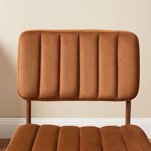 The cushioned ribbed seat and back offer great support for dining or relaxing. Soft chocolate velvet adds comfort, making meals and gatherings more enjoyable for extended periods.