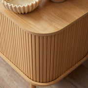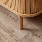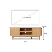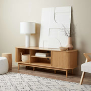 The Maeve Entertainment Unit is perfect for your living room. It has two sliding cupboard doors, open shelves in the middle, and a cable hole at the back. Made with solid rubberwood legs and an MDF frame, this unit combines mid-century style with practical storage. The natural wood finish looks great in any home.