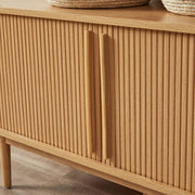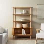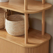 The Maeve Shelf With Storage - Natural features solid rubberwood legs and handles, complemented by sliding cupboard doors for hidden storage. Its Mid-century design offers three open shelves and a curved base, perfect for displaying books and ornaments in your office or living room. A stylish, functional addition to any space.