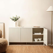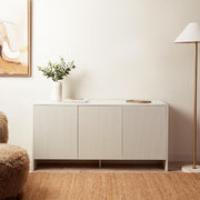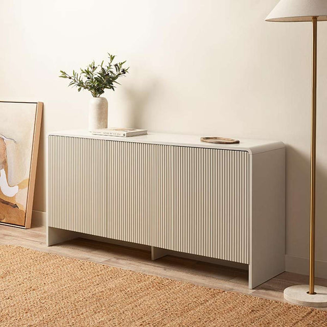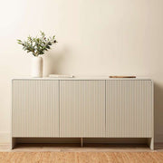 The Majorca Buffet in beige combines functionality with modern style. Featuring three push-to-open cupboard doors and a durable MDF frame, this ribbed and curved design adds charm to any room. The soft beige tone complements a variety of interiors, making it a perfect storage solution for living rooms, dining spaces, or hallways.