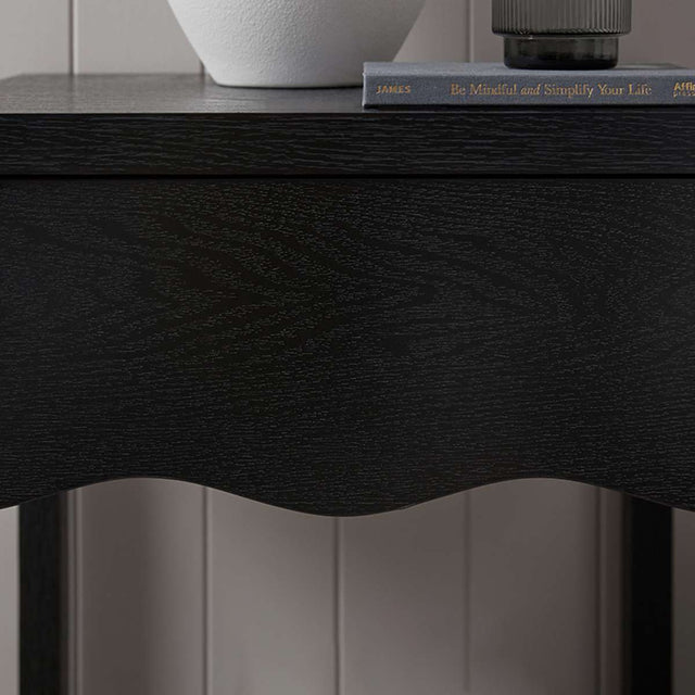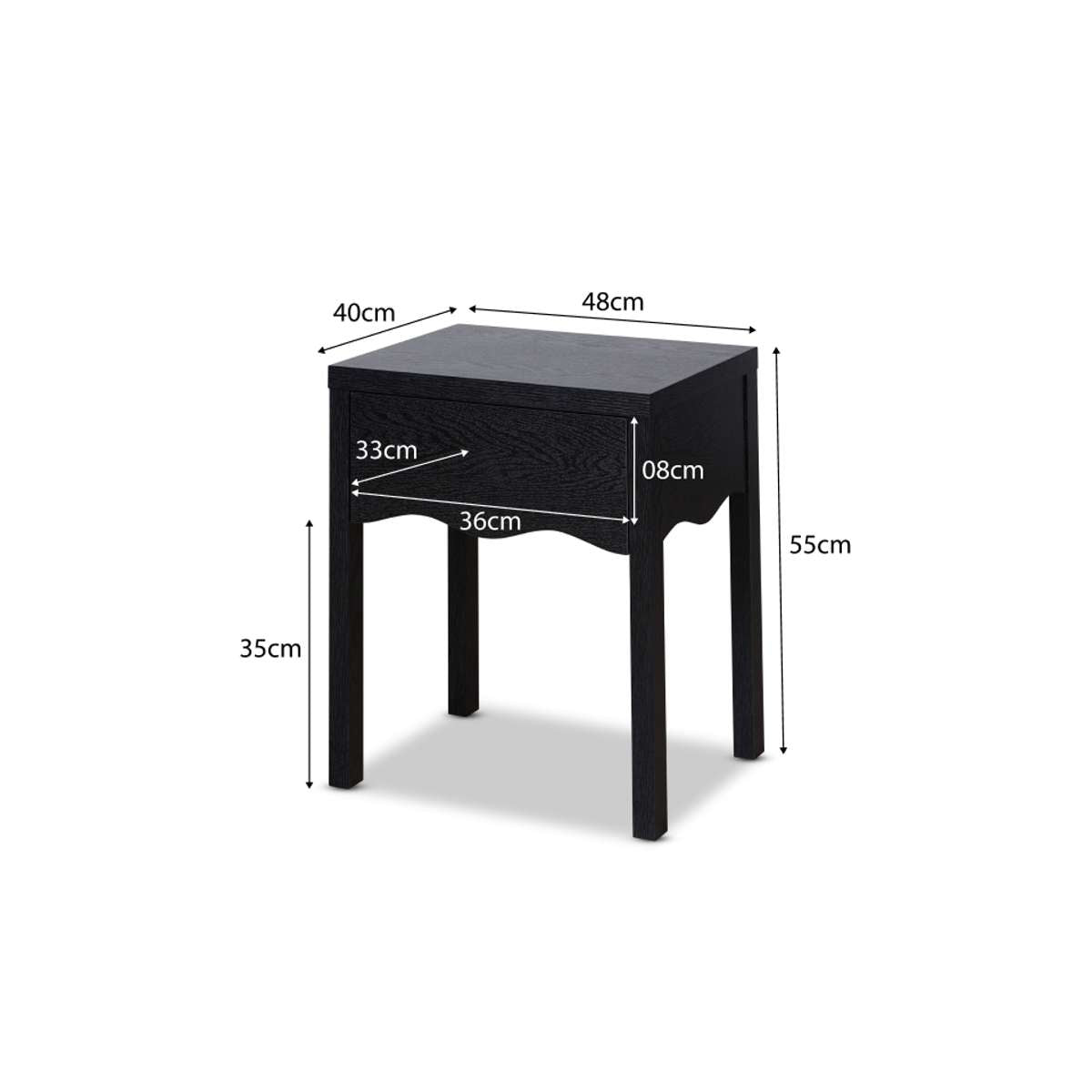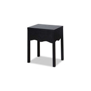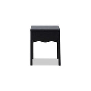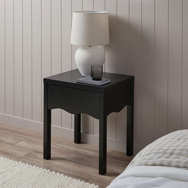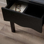 Introducing the Malena Bedside Table in Black, a striking addition to your bedroom that draws inspiration from the contemporary wave design trend. This piece offers a fresh and dynamic perspective, breathing new life into your bedroom sanctuary. Its textured surface adds a tactile element, while the drawer provides storage to keep your essentials out of sight but within easy access.