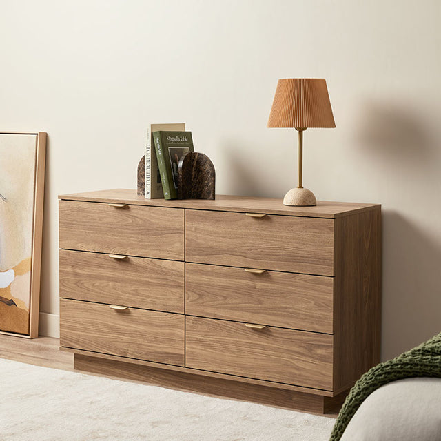 Introducing the Maverick Six Drawer in Pecan - a stylish and functional addition to any bedroom. Featuring six smooth-sliding drawers with brushed bronze metal handles, all supported by a stable plinth base. The mid-century inspired design, paired with a warm mid-brown finish, brings a timeless elegance to your space. Perfect for organising clothes and accessories.