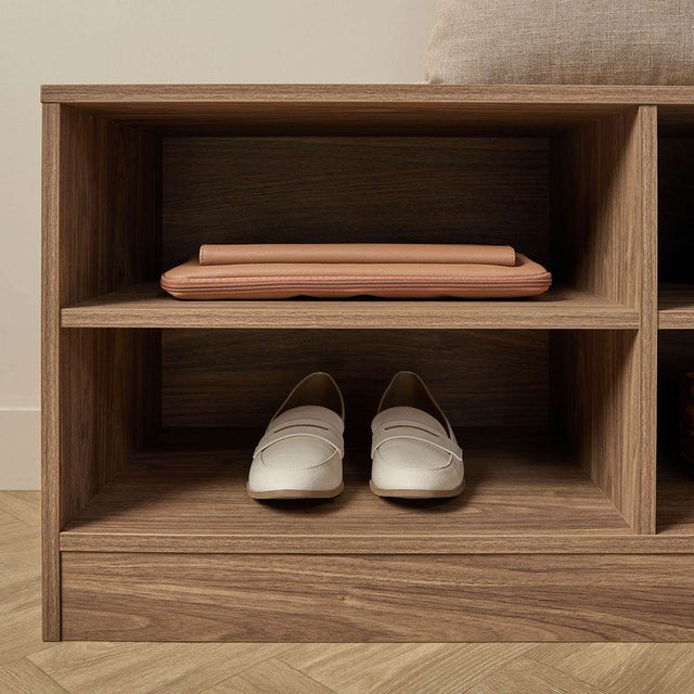 The warm, pecan wood-look finish adds a cosy feel to your home. Its timeless design complements various décors, making it a practical and stylish addition to entryways or living spaces.