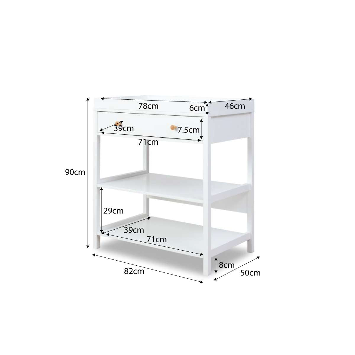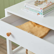 This white change table includes a drawer and two shelves to store nappies and clothes easily. Tailored to fit our Change Mats, it makes changing time convenient. Perfect for first-time parents or those looking for an affordable, stylish option for their nursery.