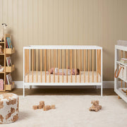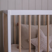 Add timeless charm to your nursery with the Mocka Dream Cot in White/Natural. Featuring warm timber tones and a sleek design, it suits any décor while creating a cosy, gender-neutral space. With two adjustable base levels, it's perfect for newborns and adapts as your baby grows—combining style, functionality, and longevity for years to come.