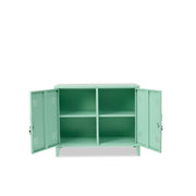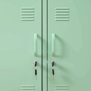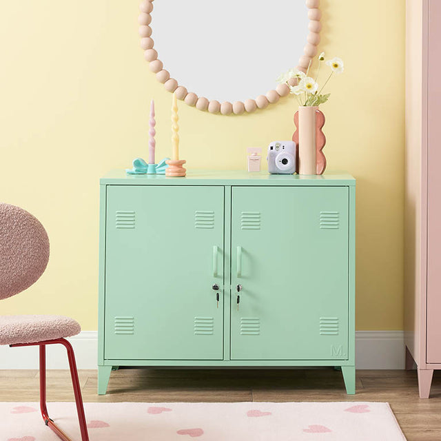 Elevate your space with the Mocka Original Locker Cabinet - Mint. This easy storage piece is perfect for bedrooms or workspaces. The fashionable mint tone adds personality and fun, especially when paired with the pink wardrobe. Ideal for storing clothing, shoes, and accessories with its lockable two-door design and middle shelf.