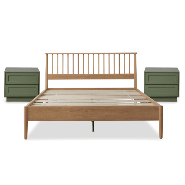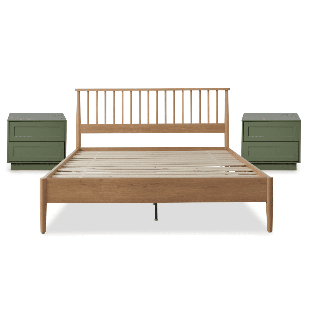 The slatted headboard of the Napier Queen Bed and the shaker-style drawers of the Eros bedsides pay homage to classic coastal design. The soothing sage green colourway of the Eros paired with the natural wood-look finish of the Napier strikes the perfect balance between relaxed beach aesthetics and contemporary refinement.