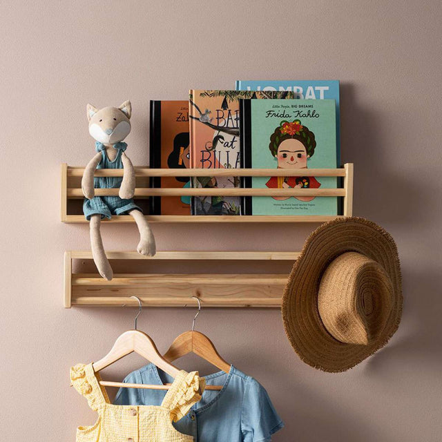 Alternatively, hang this shelf with the opening at the bottom and you can hang clothes hangers from the round wooden dowels and turn this shelf into a stylish kid's clothes hanger on the wall. We love the simple, wooden style that gives this timber shelf a handmade, rustic vibe. The wood has a smooth finish so is safe for kids to use and helps showcase the natural, wooden grains to full effect. Add easy kids' storage to your children's bedroom with the Nicho Wall Shelf - Natural.