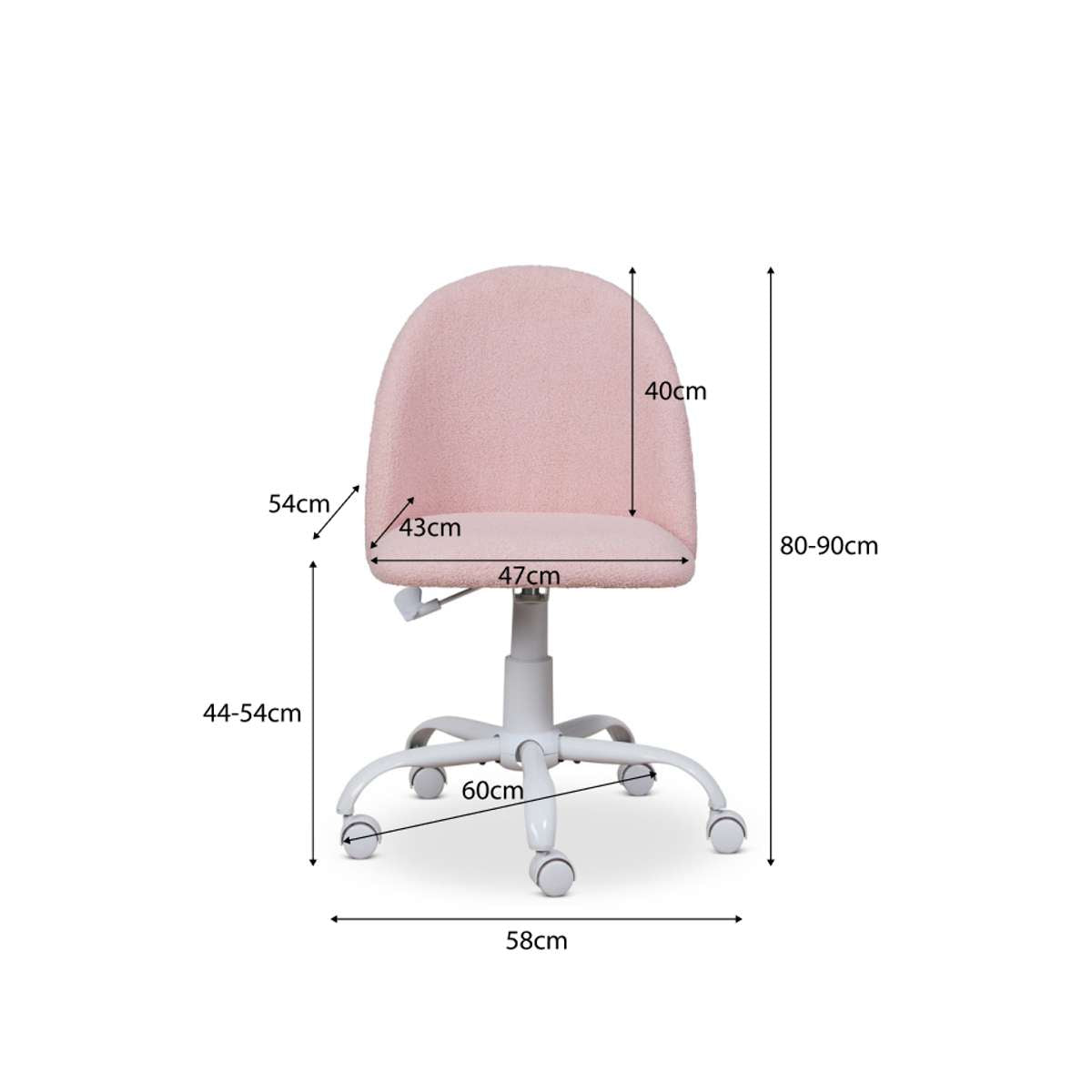 Elevate study time with the Nolan Office Chair in Pink Teddy fabric. Ideal for children transitioning to a full desk setup, it's adjustable in height and is ideal for compact spaces and small home offices. Discover the perfect balance of texture, cosiness, and functionality. Make your move now and upgrade your child's study space with the Nolan Office Chair.